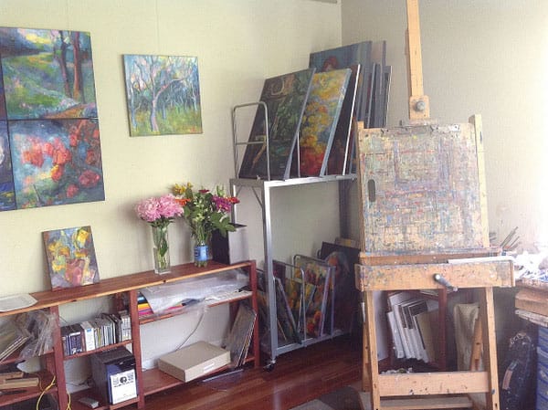 The left-side bench and the wall behind it look tidier than they normally do, because I’ve just had an Open Studio this last weekend, but it is essentially the same as ever: storage for smaller works, some paper for sketches, my very small and very classical music collection, and some recent work hanging on the wall. The drying rack in the corner doubles as a storage place for mid-size canvases.