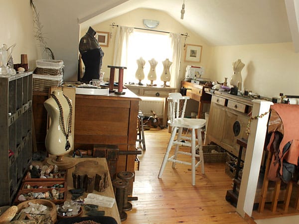 The light streaming in from both ends is atmospheric. It’s inspiring to be surrounded by my antique boxes and containers that I’ve collected over the years to house all the needed bits and pieces. All the studio furniture also brings back memories from our travels and are thus part of my personal artist history. In a way, each item in my beloved creative space tells a story and probably therefore probably contributes to what I make while working in this studio. If family commitments didn’t pull me out of my studio, I believe I’d never spend much time outside of these walls.