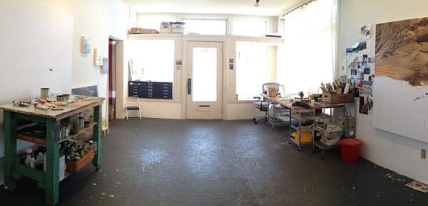 The building is from the 1920s with two storefronts and two apartments. I live in one of them with my husband and two cats. My husband and my neighbor share the other storefront that has a small kitchen, sink, bathroom, and a door to the yard. In the back of my workspace is a small storage area with my painting storage racks.