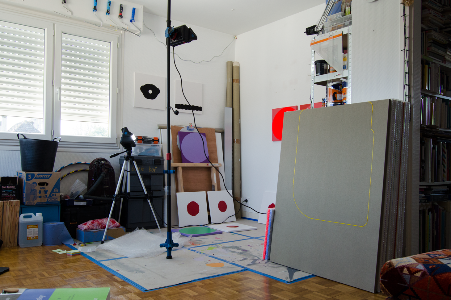 My studio occupies a very modest part of my flat: it's an enclave about 58.6 sq ft [5.4 sq meters] in the living room of my apartment. The floor is covered of cardboard tiles, connected together by a blue masking tape. Dotted with stains, traces and imprints, left by the successive projects, these slabs tend to constitute a kind of memory of my activity as a painter, in this space more definitive than provisional. This grey and blue grid on the ground, independently of its protective function, above all to define a separate and more sober workspace than that of the living room, in the way to remain there not to overrun the living environment. Which, in fact, turns out to be quite untenable, because the two converge and intermingle daily, due to a sometimes rather harsh balance. The practicality of this improvised studio is the result of a permanent effort of clear, tidy up and rearrange. This painful gymnastics is a continuous necessity which does not escape any phase of work. This is the only resolution to adopt to keep this small studio functional, alive and fruitful.