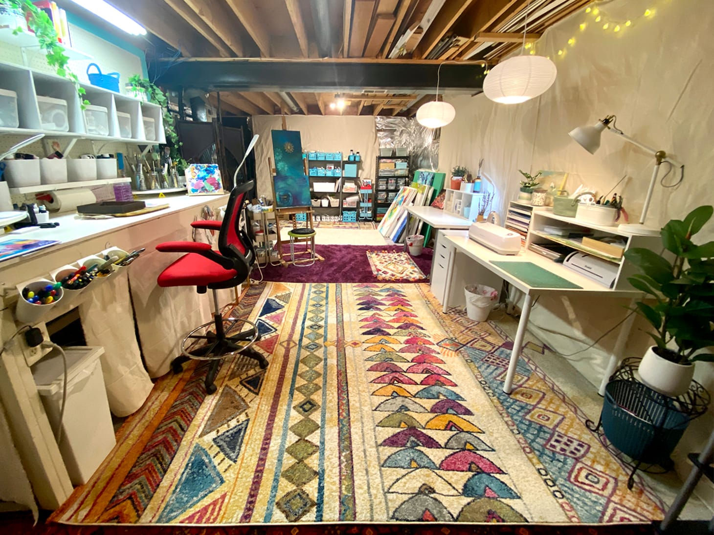 My beloved basement studio — my mental and physical haven that I spent months and months cleaning, organizing, decorating. In coming back to painting after a few years of maternity leave, in the midst of a pandemic, I experienced a beautiful sort of confluence in those nocturnal hours of solitude down here — being by myself, only for myself, connecting, reflecting. All the various voices and awareness engaged to create harmony in my soul, on the canvas — something new, yet also familiar, like a feeling of home. The more immersed I become, the deeper I become attuned. This is the experience I have every time I come down to my studio — a disconnect from the toils of the outside world, only to become more connected to my inner world, the truly authentic space I inhabit. My studio is an embodiment of what I love most in this world, what I feel is my true purpose — to beautify the world with my hands.