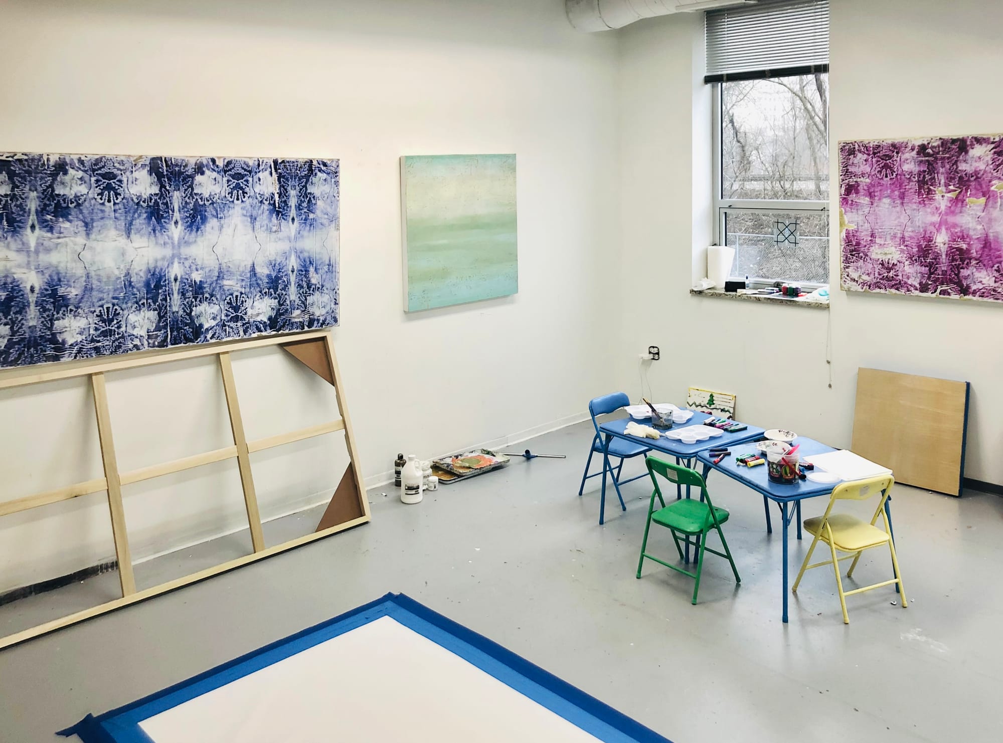 When schools closed, I had my preschooler with me 24/7. She always wanted to help with whatever I was doing, so I created projects for her that related to pattern and symmetry in nature, which are themes I explore in my work. We both enjoyed this exercise so much that we decided we wanted to share what we were doing, so we started inviting other children for masked messy art playdates in the studio. The pandemic has eroded many of the distinctions between my work and life in general. During lockdown, I eventually decided to try to embrace these blurred boundaries. This photo illustrates the evolution of my studio into a combined workplace and family-friendly space.