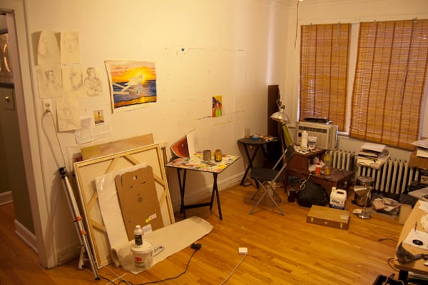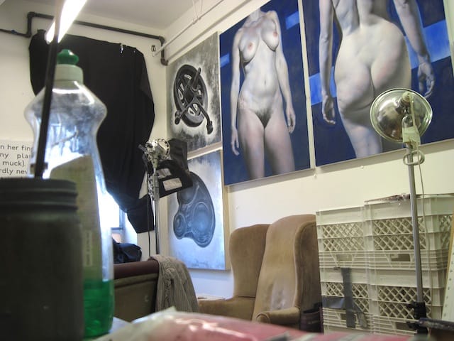 My studio is in a massive old factory building. I paint a lot of figurative work, with a model present. I chose a long, narrow studio so that I could get far enough back from my models to get a stable perspective. Like every other space I inhabit, it has become utterly cluttered. My supply table (actually a wheeled kitchen cart) is in the foreground, where the brushes and tubes of paint live. The work area includes milk crates and wooden boards to make modular platforms, chairs for me and for models, and lights for the model and the canvas. The window has a spectacular view of Manhattan, but I don’t look out of it nearly enough. The walls are covered with current and favorite work. This is my second home. I feel comfortable as soon as I get through the door.