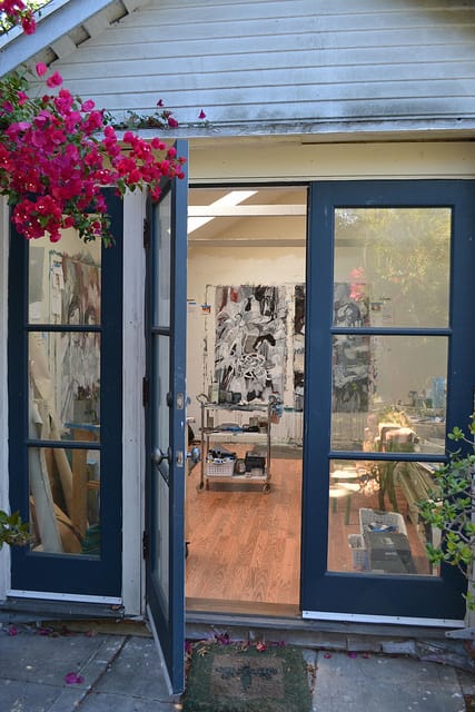 This space is my safe haven in a neighborhood full of barred windows, helicopter sounds and loud hip-hop. I love the minute or two through the yard to this space and being able to see the boisterous garden through the studio window. I mostly work on the walls, moving around the carts to accommodate my supplies. I like working on multiple pieces at one time, letting some pieces rest while others are active.