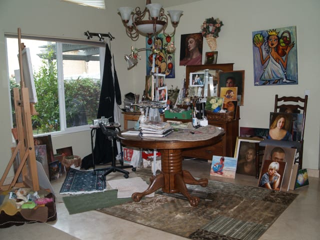 All finished paintings are stored in the office or in the garage in holding bins. All the canvases seen here — out and about — are things that are not quite “working” and in process of being reworked or will be re-gessoed to start over. Paintings that hang are just up on the wall to “decorate” and are not in process, but are art for the walls. I also have paintings of two other friends close by to remind me of their inspiration in my own painting. My trusty best friend pooch of 15 years died recently, so his pillow (lower left) has become a shrine and gives me comfort while I work through the grieving process.