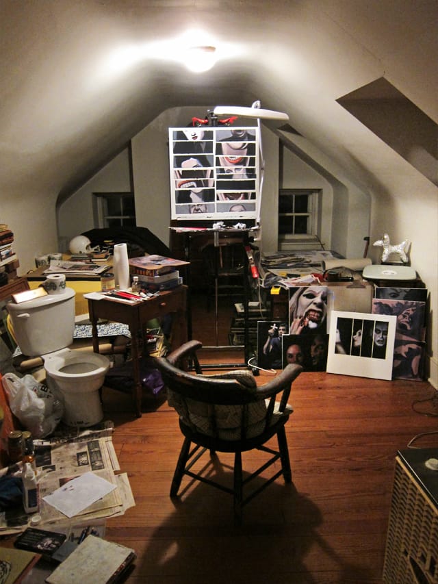 My studio is on the third floor and as you can see it’s one of the great artistic clichés — the lonely garret where I slave away unbeknownst to the art world at large. I paint in oils so I have a system of fans set up for ventilation.