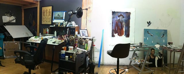 This, by far, has been the best studio I’ve ever had. From left to right: My main drafting table, which sits underneath my storage loft. I do a lot of drawing and a lot of studies before working on a piece. The entirety of that part of the process happens there.