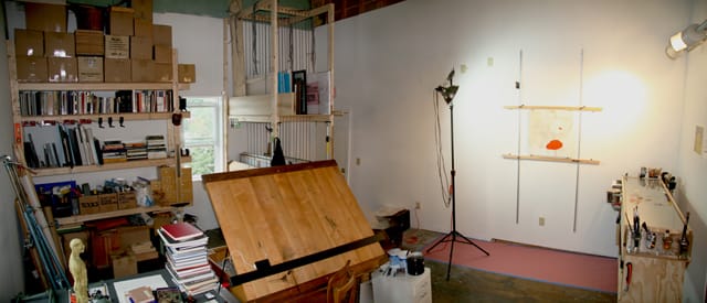 I’ve just completed modifications to my studio. Here it is in full painting mode. I made all of the furniture in here, though the steel flat file was traded for some art lessons. The drafting table is central in the room; it’s where I do most of my reading, thinking and drawing.