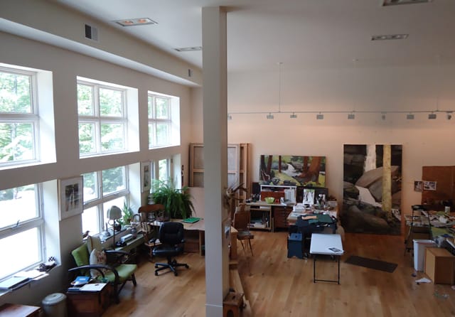 I need to back up to see my paintings so the space is open to the rest of the lower floor, allowing me a clear view of the easel and work wall across about 60 feet. The sunlight is soft and constant, and after 26 years of freezing in Brooklyn lofts, I am thrilled to have geothermal radiant heat under the floor.