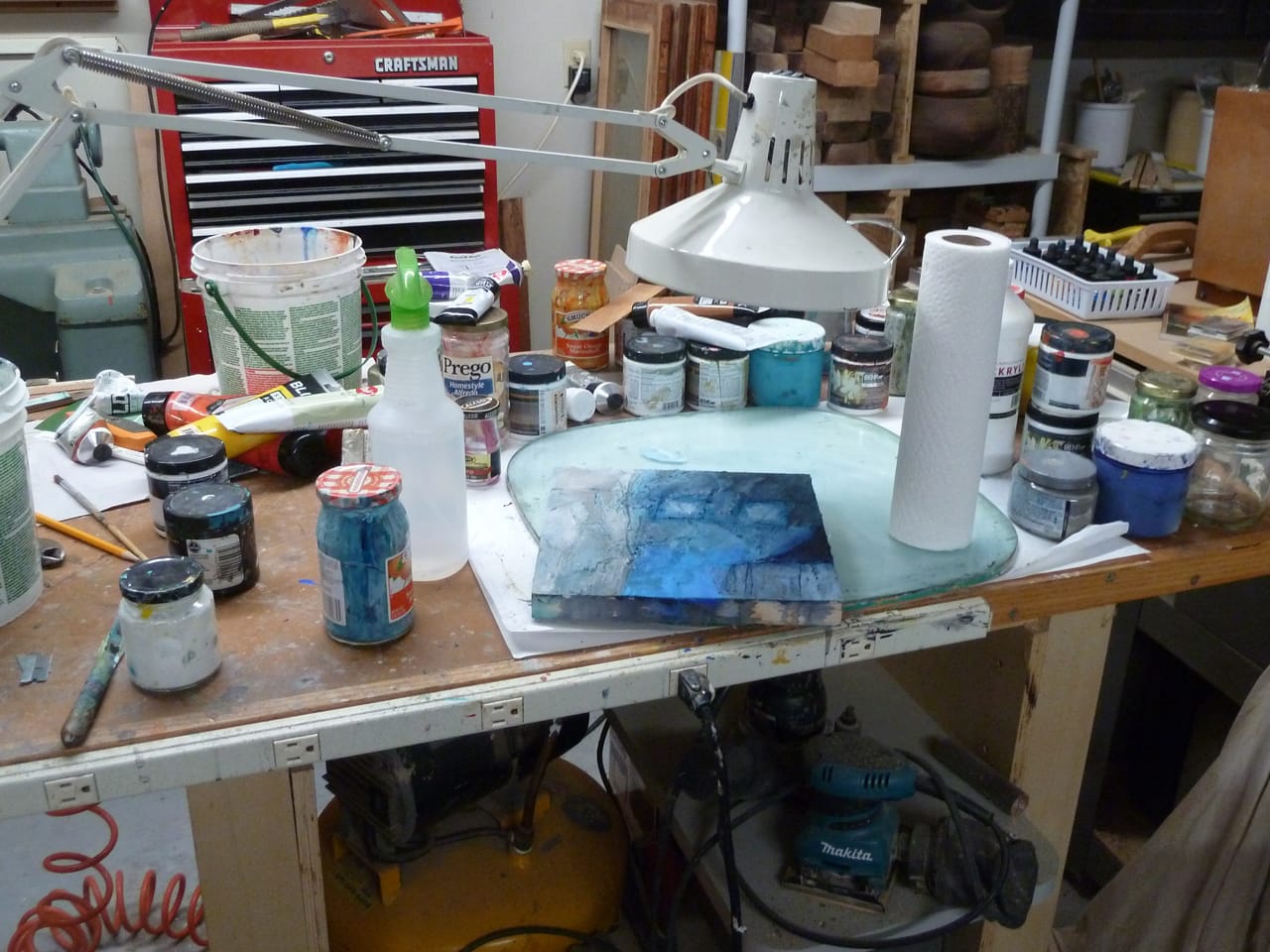 My studio is really a converted two-car garage. The studio still houses construction and lawn care equipment, but is used daily for painting. There are a couple of roll-around worktables such as seen in the photo. Usually there are at least two to three pieces in progress on various tables, sawhorses, and easels. Lots of portable shop lights for drying and vision, but the lighting still leaves something to be desired. Drying and gravity are a big part of the process, with layers and layers of paint applications on panels over custom-made stretcher bars. Most paintings require about a month from prep to finish. Many times the paintings are painted over and over until the final is deemed finished. The paint is applied thin to thick from start to finish, with chisels and grinders used in the process to provide “construction” marks and scars. No matter how much the studio is cleaned, it always seems to be in disarray, and in “process.”