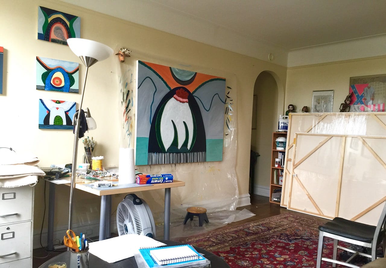 My studio space is in an old Victorian townhouse. The floor to ceiling windows let in lots of morning light. I have track lighting around areas that don’t get much direct sunlight. I like to have a clean slate when I begin a new series. This view of the studio has finished abstract paintings and a work in progress on the floor. Since my process is spontaneous and active, paint goes everywhere. I typically use acrylic paints on canvas with cardboard barriers to protect the floor and rug underneath. At the end of a painting day, I arrange all my materials and supplies so I can have a fresh start when I return. All of my studio furniture has wheels and can be reconfigured for different projects. I’ve just added a couple more rolling carts with tops so I can work on smaller pieces. My paints are stored in plastic containers on the metal shelves and my other resource materials are stacked into old cigar boxes that I use as bins and store them under the table. I love coming in and seeing all the vibrant colors waiting for discovery. It’s a kickstart to begin the creative process once again.