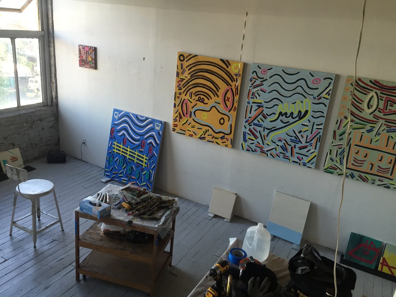 As you can see from the image of my studio, I have large abstract artworks on the walls and some other artworks ready for delivery to clients. I have ample space to move around, industrial lighting, and a work station (in the corner of the image) that I built to organize my paints and art materials.