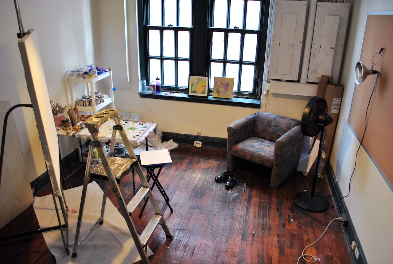 My current studio is housed in an old boarding house. There are sixteen studios in our walk-up building, plus communal classroom, kitchen, and outdoor space. This set-up, coupled with the din from the restaurant housed directly below my studio, keeps me from becoming a total hermit.