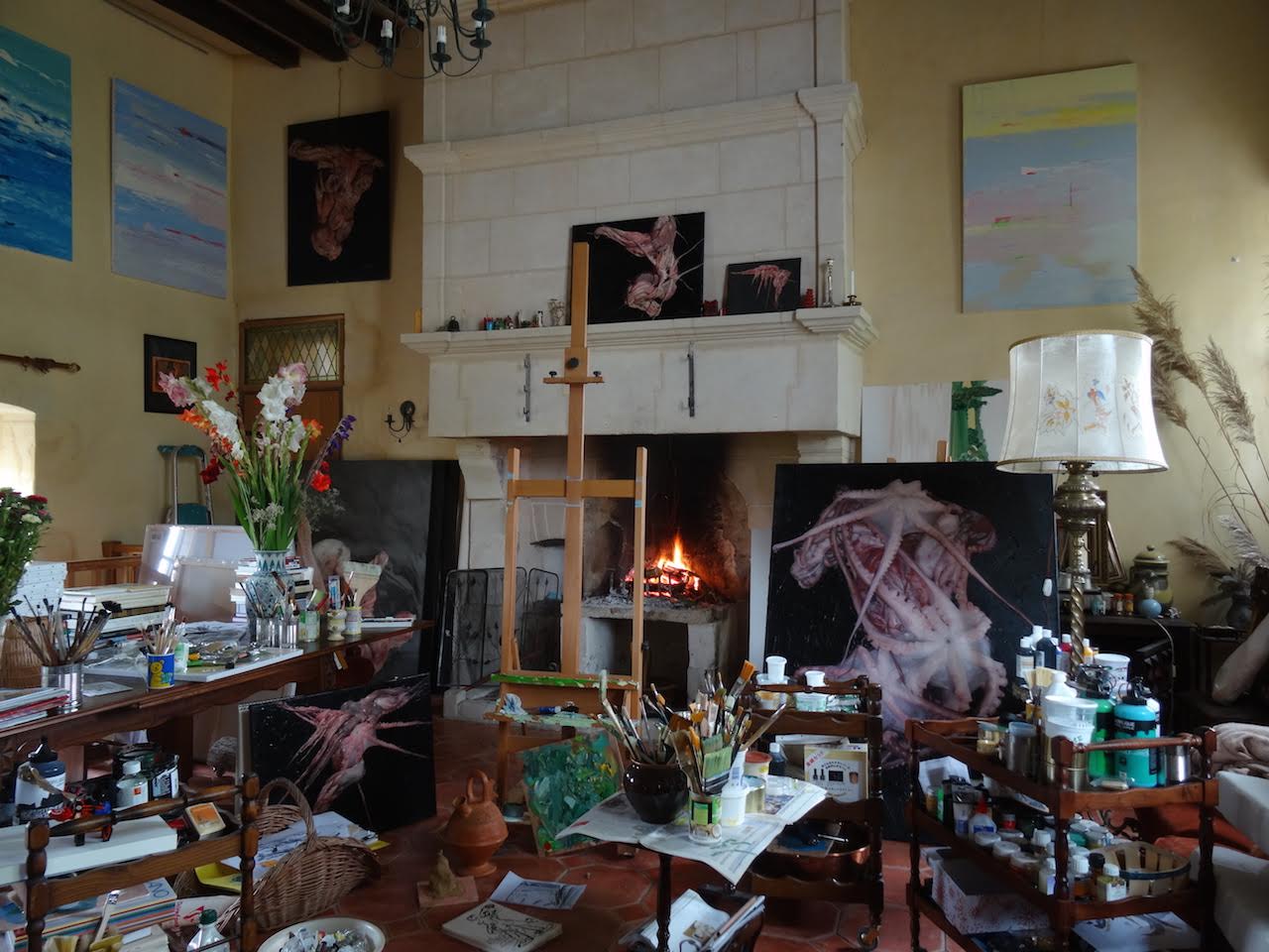This is my summer studio where I come to work on my large scale paintings and sculptures of torsos. Every day I work here on my paintings. As most of them are in series, I work simultaneously on several paintings. I have about 8–10 easels and lots of trolleys with different media. As you can see, the wonderful Renaissance ceiling of this ancient chateau gives me a great space to work on a large scale. I work here on lots of paintings that are about 3–4 meters. I also very much enjoy a fireplace which gives me a wonderful inspirations and heat when summer is enough cold and rainy.