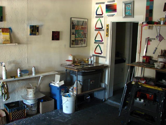 Tools of the trade: self-made color charts, a wall mounted easel/shelf, tools for building, cutting, sawing, stretching. A floor I don’t have to worry about getting paint on. An ART STUDIO should be the creators nest: things found and arranged to provide absolute comfort and freedom to give birth in.