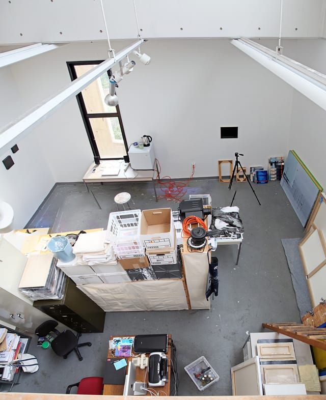 This is a view of my faculty studio in the Visual Art department at Brown University. It is about 400 square feet, with a 24’ ceiling and skylights. I am very fortunate to have such a beautiful and spacious studio. In this view, you can see a wall of shelving in the middle of the room that divides the space into two sections.