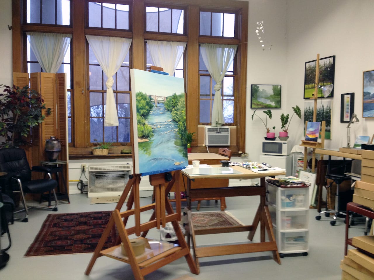 The most important aspect of my studio is my salon corner (to the left), where visitors and clients can sit, visit, and look. My grandparents’ dining room table in front of the windows acts as a desk for computer work, an extra surface when getting ready for a show, or a place to sit and eat. Out of view is an entire wall by the door with shelving for work.