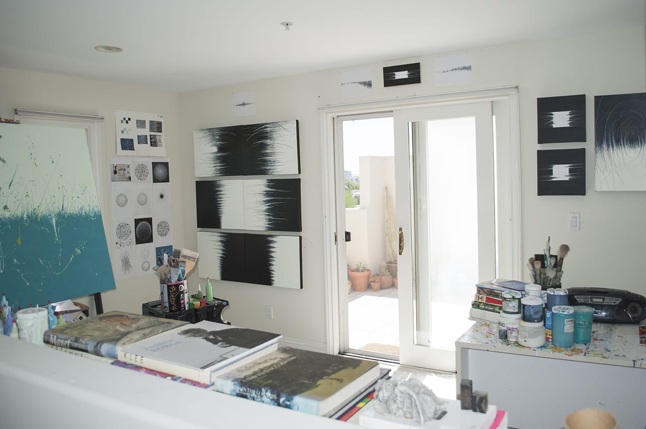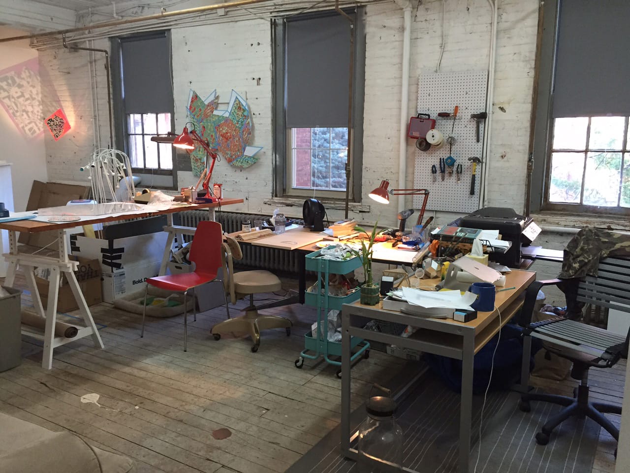 This studio view shows my three workstations, one for my plexiglass work, one for painting, and one for design work. Having a single space to make work in a variety of media allows my practice to ebb and flow as needed during my workday. My windows face the interior courtyard of Manufacturer’s Village, the original home of Johnson & Johnson over a hundred years ago.