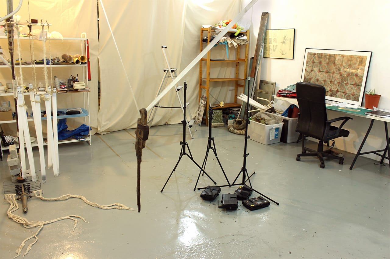 Considering the property value in the city of Hong Kong, my studio is considered large. This is partially because it was an abandoned puppy mill before I came in and partially because its located in an often overlooked and slightly derelict pocket of industrial buildings that is ebbing its way into gentrification. The objects that make up my sculptural pieces are entirely composed of found debris/artifacts taken from abandoned spaces (some of which are in my area). After every exhibition the pieces are disassembled to be later reinvented into other pieces for the next exhibition. This photo was taken mid-disassembly soon after an open studio event.