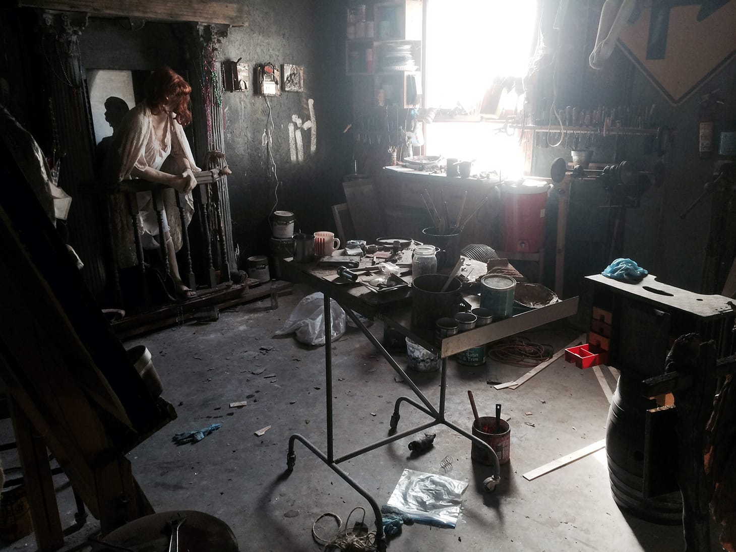 This is the “Black wall,” which is the first wall that you see when walking into the studio, and it serves as a large and primary easel, with a new set up currently under construction involving old car jacks.