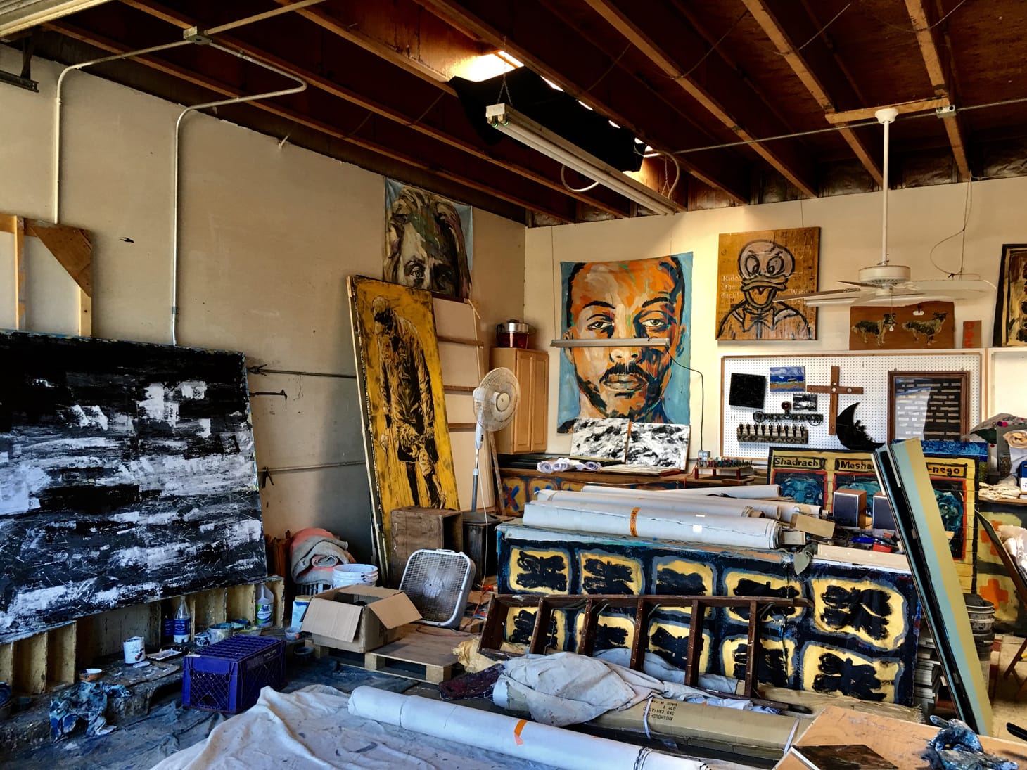 My artist studio is 1,000 feet in a light industrial space located in Ventura, California. Most of the work is large-scale, starting at around four-foot, up to 15-foot canvases. As you can see in the foreground, there are canvas rolls in a variety of sizes. The large pieces of canvas are stretched over stretcher bars, and then once finished, cut off and stored for upcoming showings.
