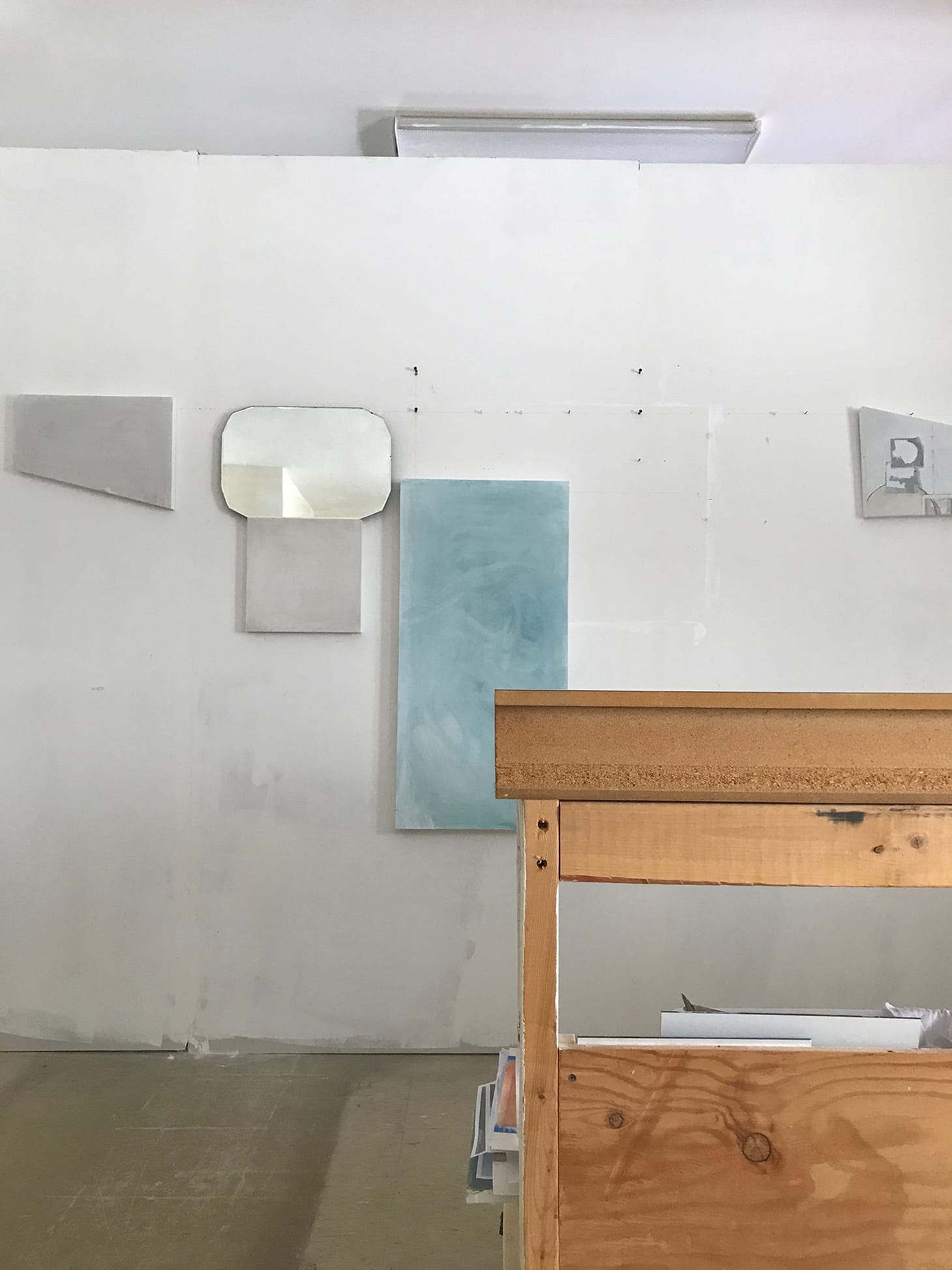 Lately, I’ve been building a wall (in the studio), and fixing a fixer-upper house, so there are lots of materials that feel like that. I love the seam between floor and wall and tend to see it as a studio landscape, with possibilities of light, gravity, and perspective coming through the objects and their composition. The function of things is also of interest. In this image, the table changes from the place where my paints and papers and lots of other stuff sit on, into a design element, interjecting and overtaking the beginnings of a wall composition. The light is something too.