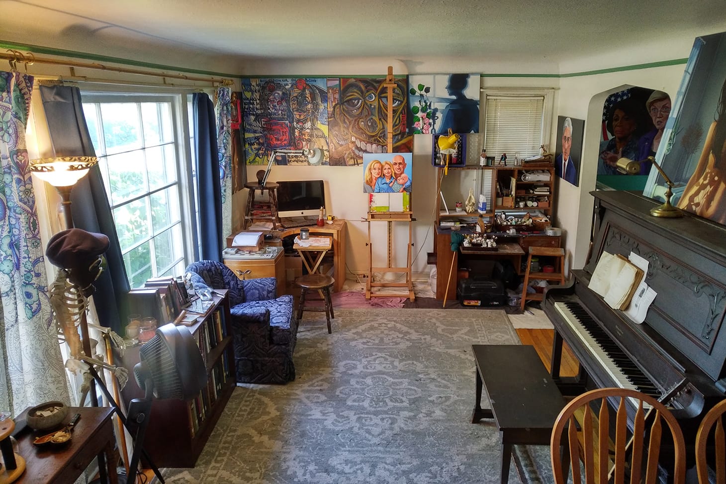 The view from my easel contains, from left to right, Stephon the Skeleton (one of many Memento Mori in my studio), my art literature (art history, technique, artist books, etc.), my “Thinking Chair,” chess set, computer for reference, my easel of course, paint supply desk, and piano — as lit by my big picture window.