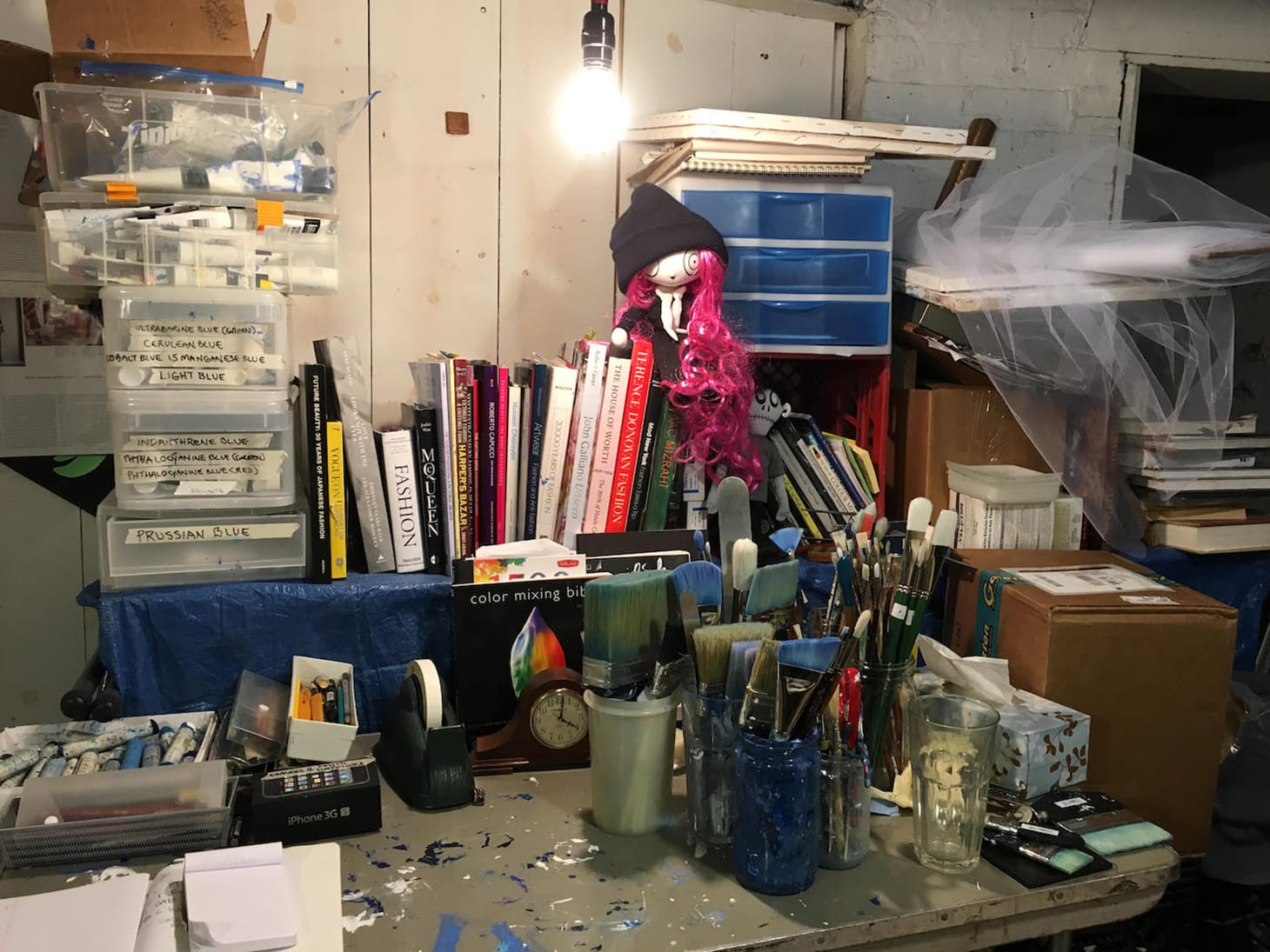 The Lenore doll perched atop the books used to have yellow braids, but in a previous studio, some mice ate all her hair, so my husband bought her the pink wig she wears now. She has been with me through the last 20 years in every studio I’ve had. At the far right is the white tulle fabric I use as a brush at the end of my painting process.