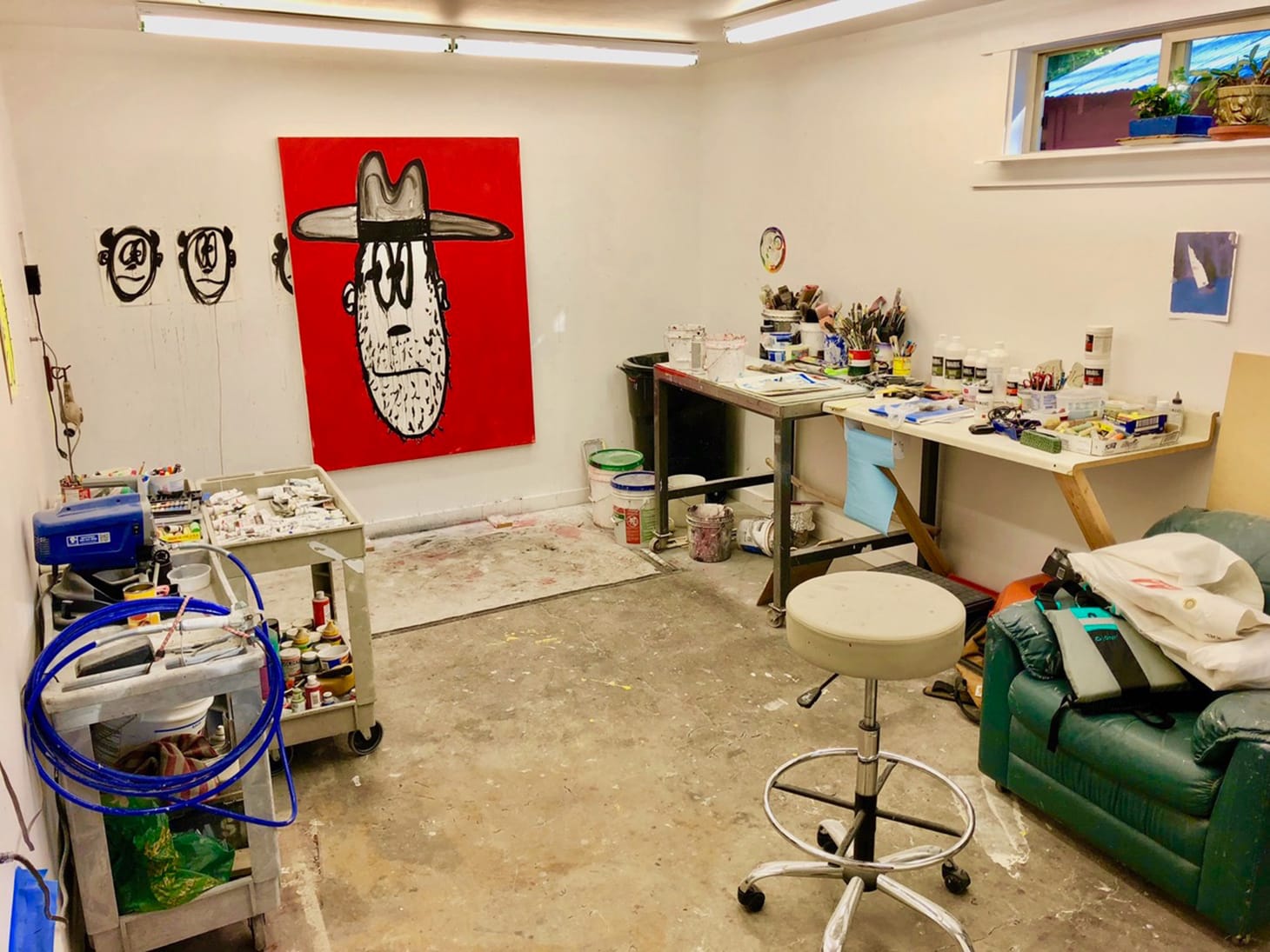 I like “work,” and it plays into my daily practice, so building stretchers and stretching my own canvas are not only cost-saving moves, but this also helps me to think about my work and the next steps. There are only three windows, so tube lighting works fine for me. I use mostly water-based materials due to vapors and what I consider bad smells. There is no sink in this space, so I use five-gallon buckets of water to clean up brushes and mix materials. My work is a mix of figurative, graffiti, humor, and some sort of self-image that I have of myself from dreams or sketching ideas.