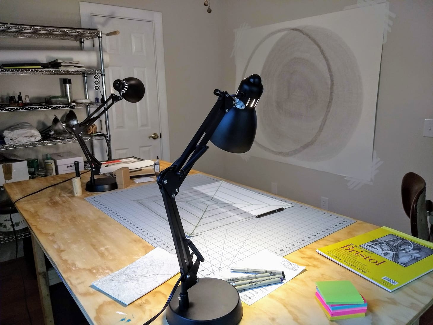 This is my brand-new, very first studio that is not at school, and is not also my bedroom. (Come on over for a studio visit! I won’t even awkwardly ask you to just ignore my bed and dirty laundry in the corner!) Living in a little town a bit away from the action allows me to afford a place with an extra room, which I quickly outfitted to get rolling on some large-scale drawing.
