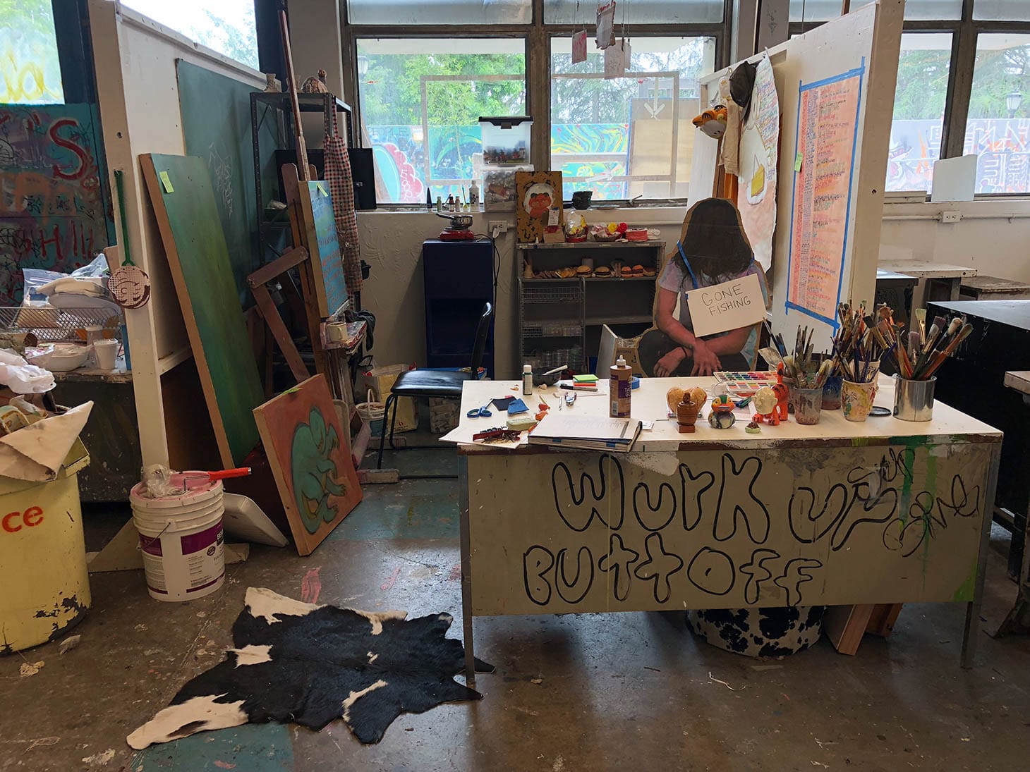 This is my Berkeley studio. The left side of the photo shows my painting section, far back is my sculpture side, and to the right is my drawing/watercolor portion. The desk is my planning and relaxation area, but I’ll be honest, it’s also a clutter collector for books, treasured objects, stationary, and brushes. The outside (seen through the window) is the host to canvas stretching, messy experimentation, and lung and/or liver abusing.