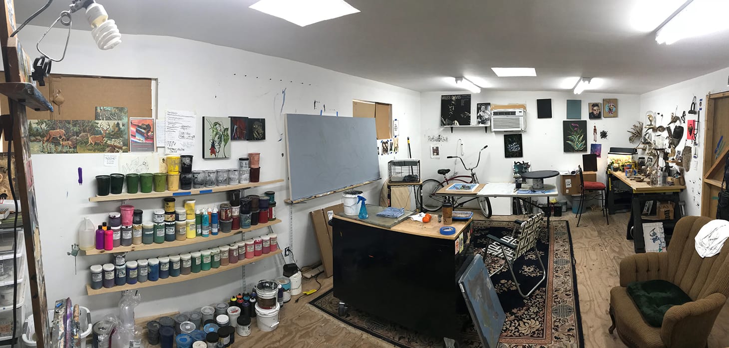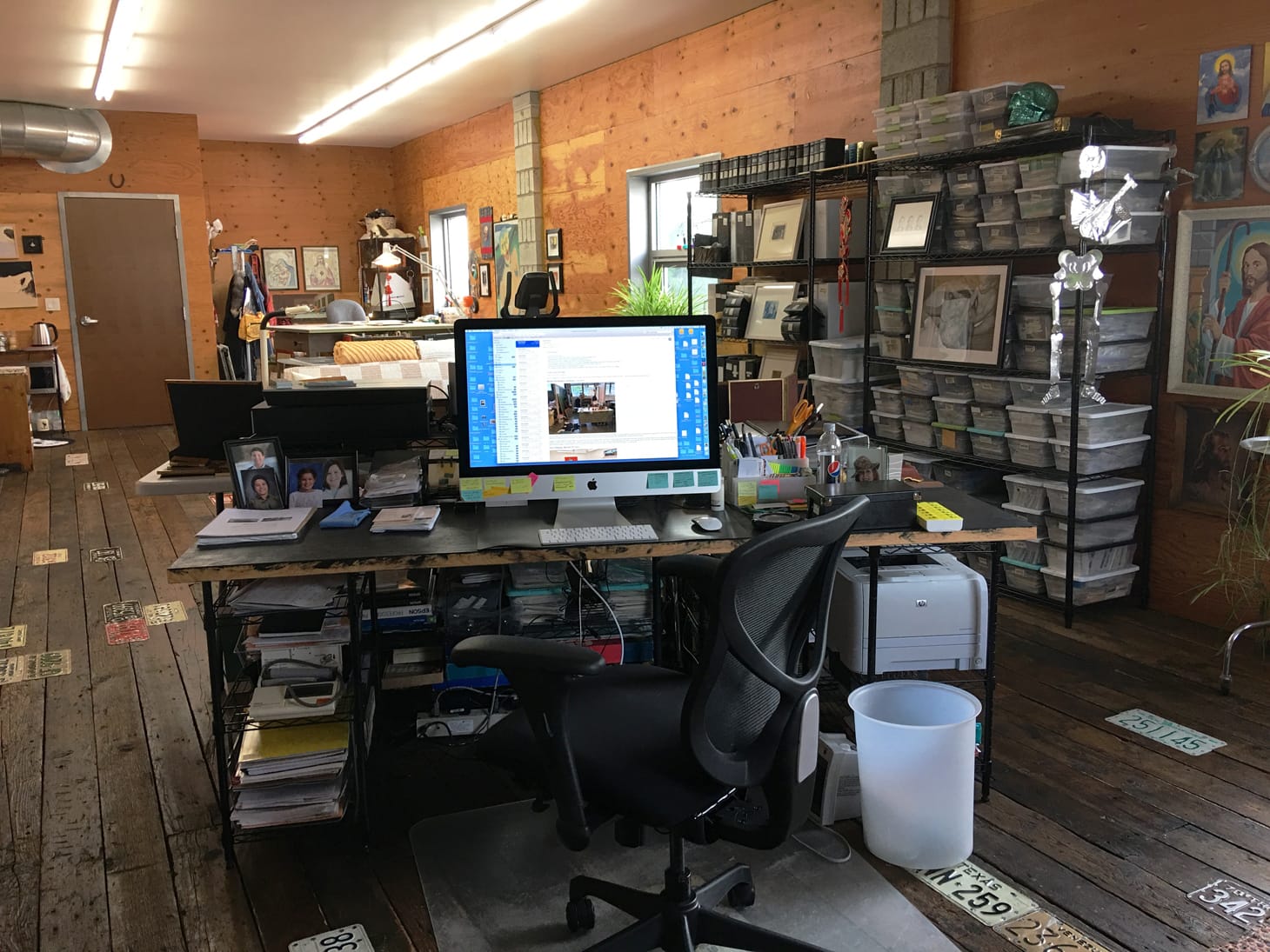 My studio is in a converted, 1946 sheet metal shop that my partner and I remodeled into a live/work space six years ago, after our home was totaled by fallen rocks. My space is upstairs in the back of the building. The floor is original and came with holes and abundant splinters that I continue to abate by nailing license plates over the worst places. Around the room is my collection of Jesus images (the 1960s paint-by-number on the right is my latest acquisition), skulls and skeletons, and friend-made artworks.
