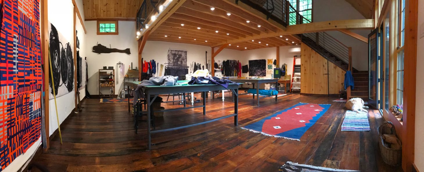 After working out of my son’s 8 x 10 foot bedroom for nine years, where I had one five-foot folding table and one 6 x 8 foot pinnable design wall, I was finally able to build my dream studio on our property in Lewes, Delaware. I work in textiles and need very large walls to pin up fabric. I now have six pinnable areas that are 14 feet high and 12 feet wide that allow me to work on six or so pieces at a time. I also have two industrial cutting tables that have totally changed the way that I work. Finally, I have room to stand back and see my work from a distance. And I don’t have to remove one piece to work on another.