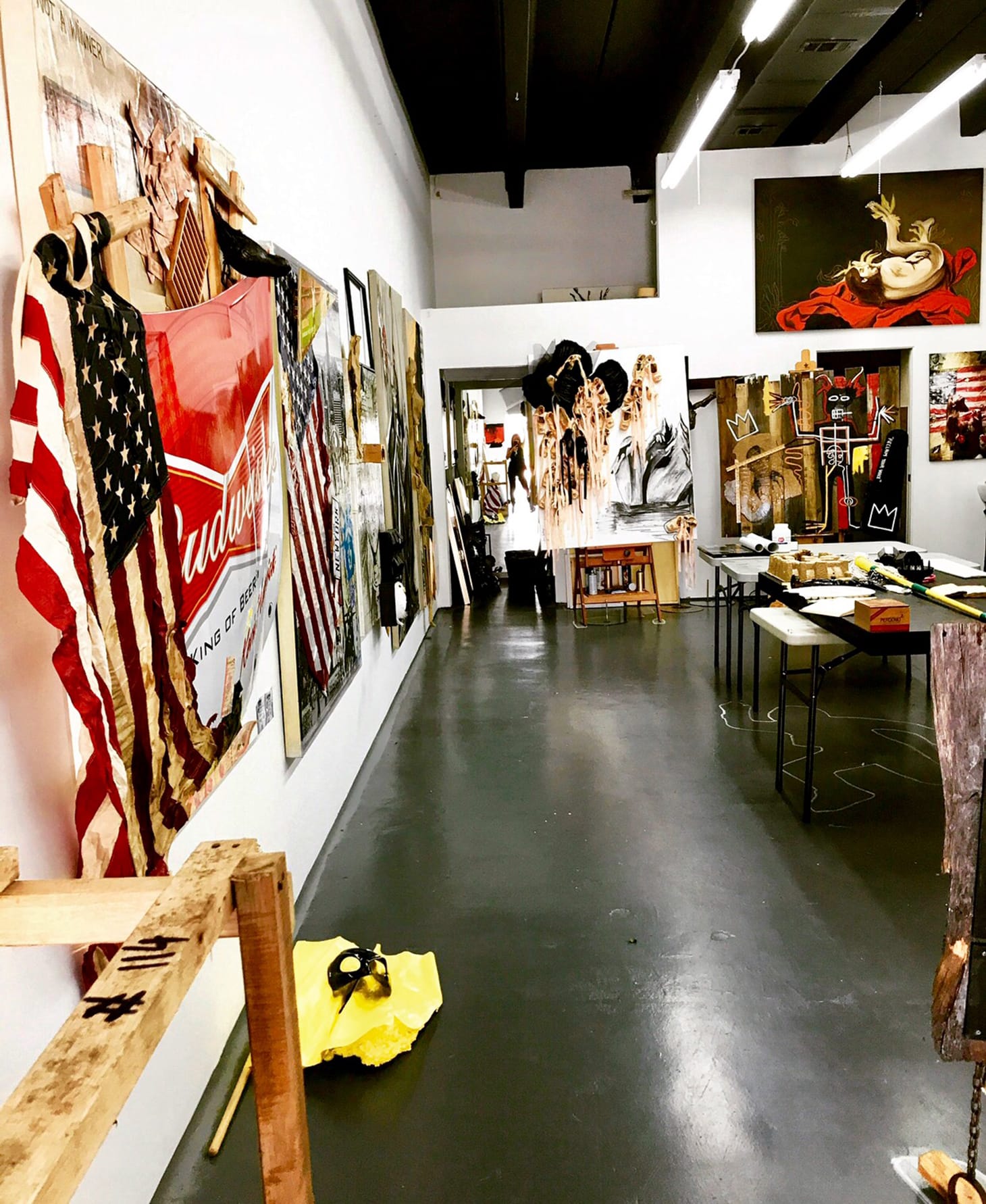 My name is Leonor Anthony, and this is my studio space. It is located in the Bird Road Art District in Miami. The area is comprised of mostly Latin American and Cuban artists. Even though my studio is a warehouse space, it has very high ceilings and a front glass door that allows beautiful light to get in. In this image you see several works, most of which are in progress, even though they are hanging. By hanging them up I have a different perspective of how the work is coming along, as if it were being seen by someone else. On the tables on the right, I am working with found objects to create a self portrait. Under the tables is a silhouette of one of my interns. Every time I get a new one, she goes on the floor, and I sketch her body. This practice usually gives them a clear idea that this is no normal internship. This is my little piece of heaven, where all things insignificant and great alike can have their place in a piece of art.