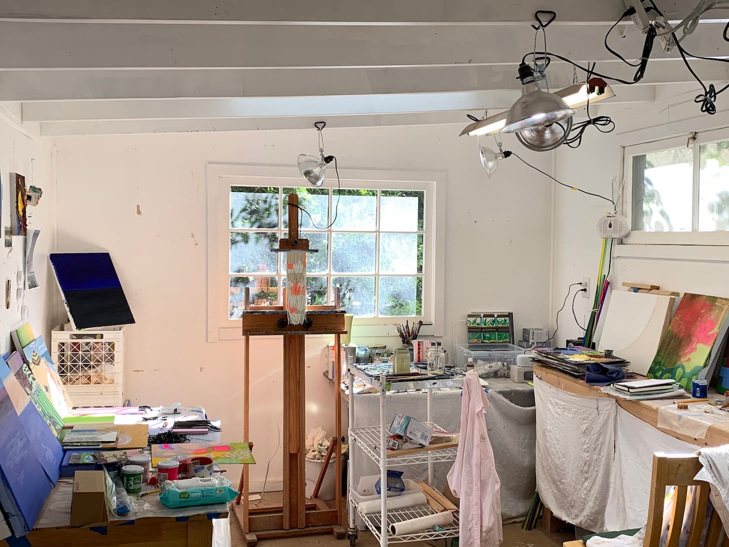 My spouse is a medical professional who has (fortunately) been working every day, so I am holding down the fort with our three teenage sons. I teach visual art in continuing education at two local colleges, but my spring classes were cancelled due to COVID-19 and not moved online, so initially I thought I might have a bit more time for my studio practice. However, it has been a massive adjustment to have my sons at home all day. At first I felt I needed to be around to oversee the boys’ distance learning. Now, I am around in the mornings to make sure everyone is where they need to be, and then I generally go to the studio for a few hours in the afternoons. I rent a studio in a local arts center about two miles from my home. It is a private studio in a standalone building, so I am able to be there without seeing anyone else.