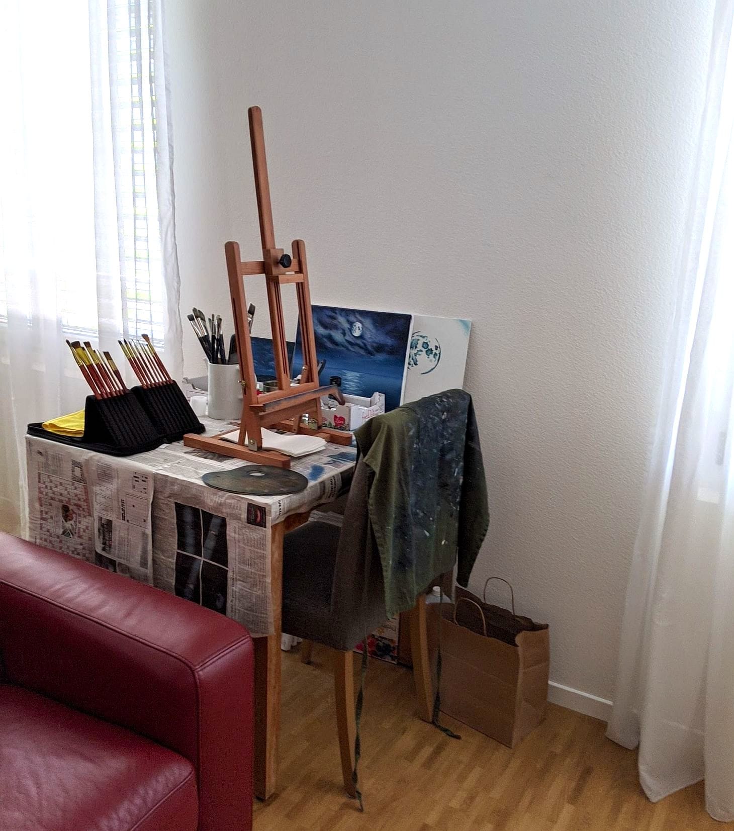 My current set-up is between two bright windows, on a patio table covered in newspaper, with a kitchen chair. I paint with oils, with plans to buy a few items here. I only brought my brushes and apron, so we ordered paint, a small easel, a few mediums, and canvases from a local store. I am learning to be better at color mixing and to be very stingy with supplies.