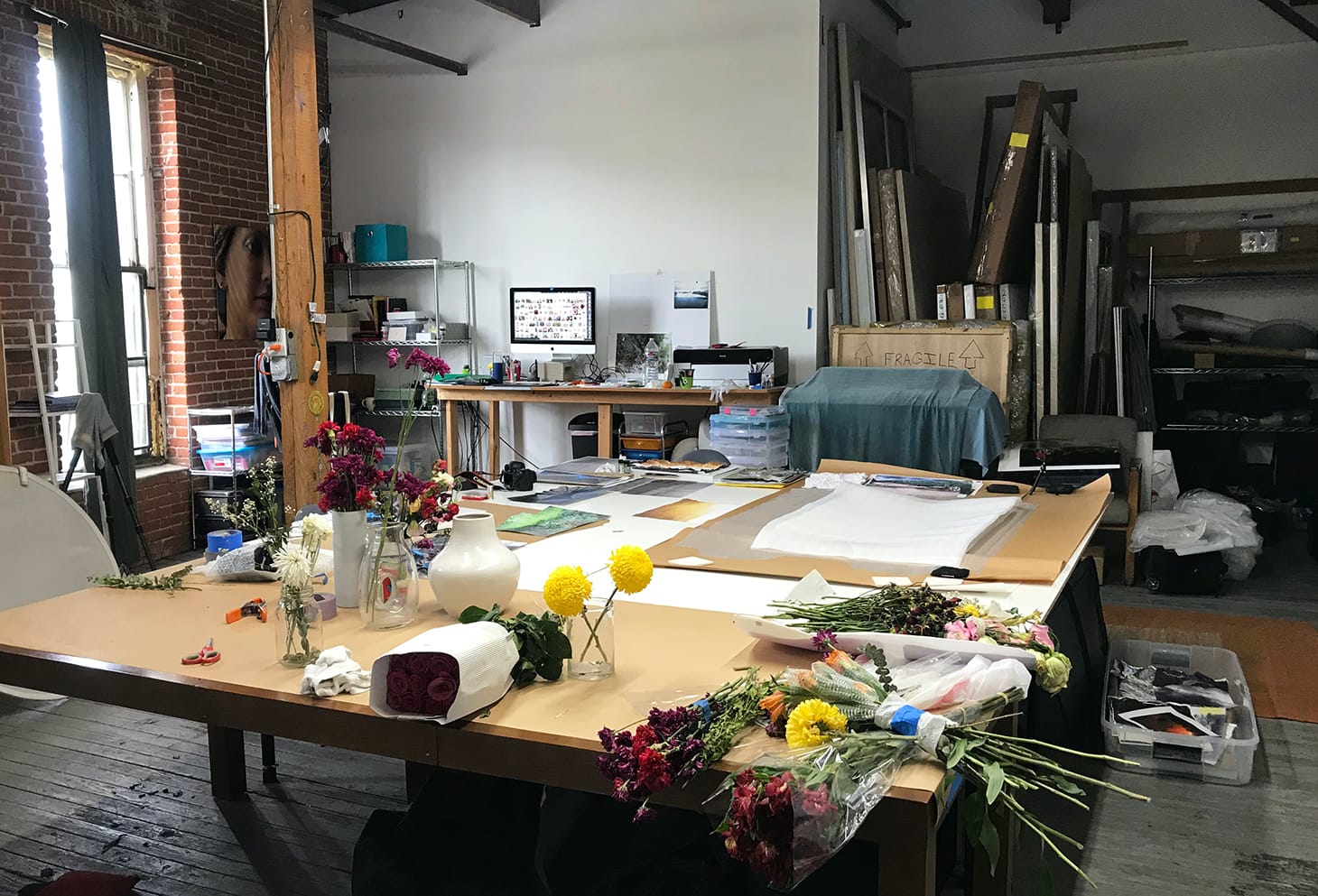 This photograph is of my studio in Los Angeles, where, because of the privacy, I’ve been able to consistently work during the crisis. On the table are bunches of flowers which I found in the trash, or purchased, at the last open shop in the downtown flower market on the day all businesses in Los Angeles were forced to close. I photographed the flowers every day through mid-March and into April.
