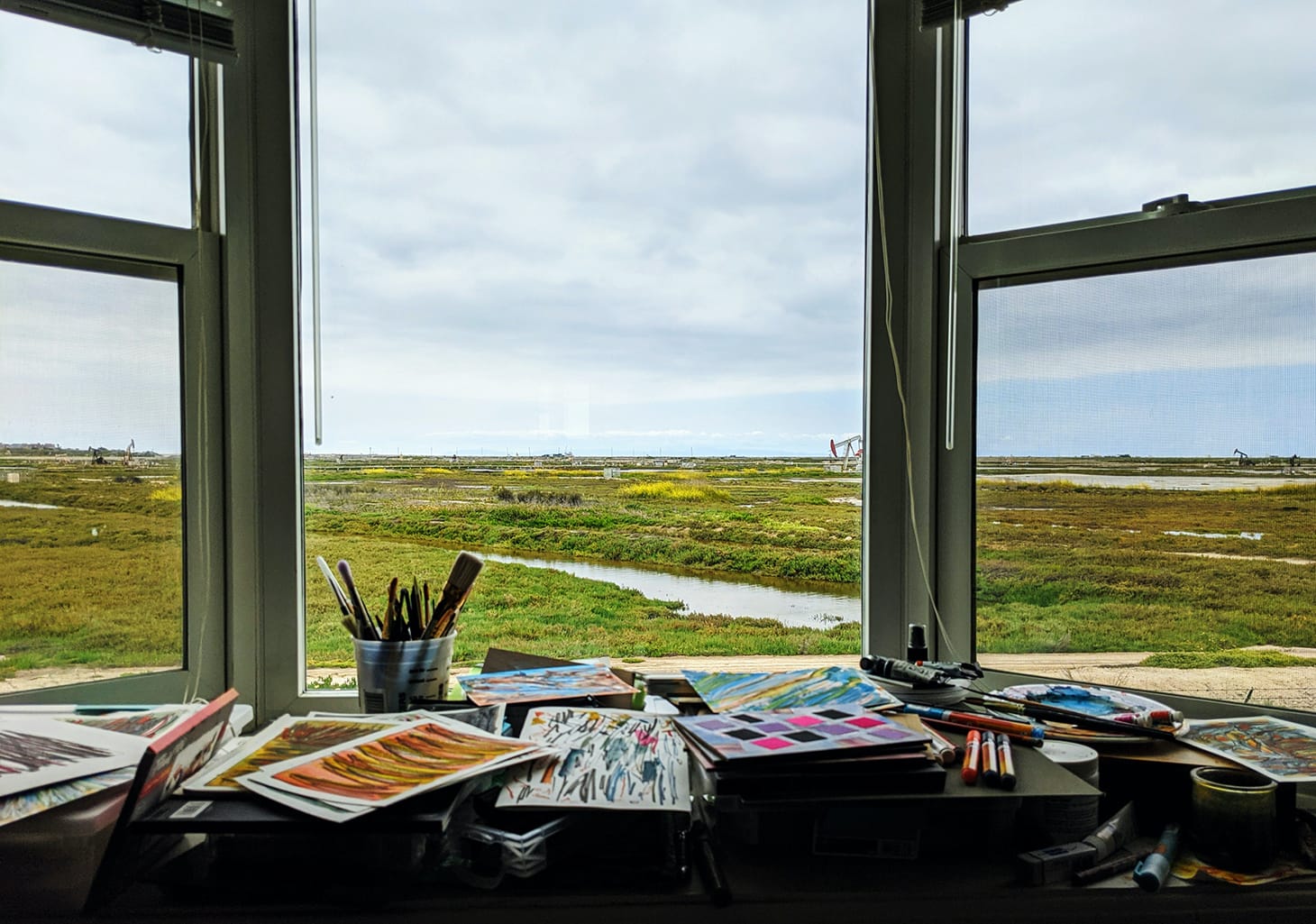 But I am confined to a room with an alcove window with an expansive view of tidal wetlands and can faintly see some cars in the distance driving on the Pacific Coast Highway and can make out a few low structures on the state beach that borders the ocean. On really clear days I can see Santa Catalina Island which is about 30 miles off the coast. My workspace is the alcove shelf where I’m working on small, mixed media pieces, mostly on watercolor paper. I stand at the window to work and the sense of openness at the edge of the land and the big sky is exhilarating. Though I’m confined right now to a small single room, my inner vision feels exalted and the future is open and fearless.