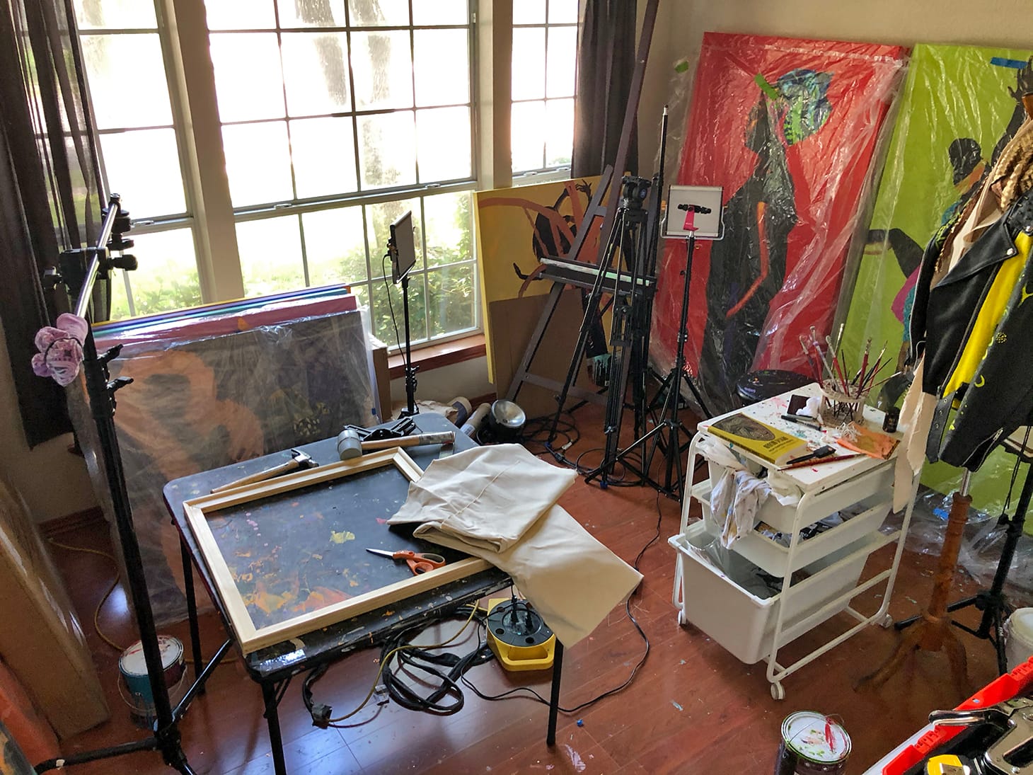 My studio is a small room in my home. I chose this room because one of the walls is covered in windows that allow light and warmth to pour in. I paint in this room while listening to music in my headphones. I also use the room as a photography studio and a storage space.