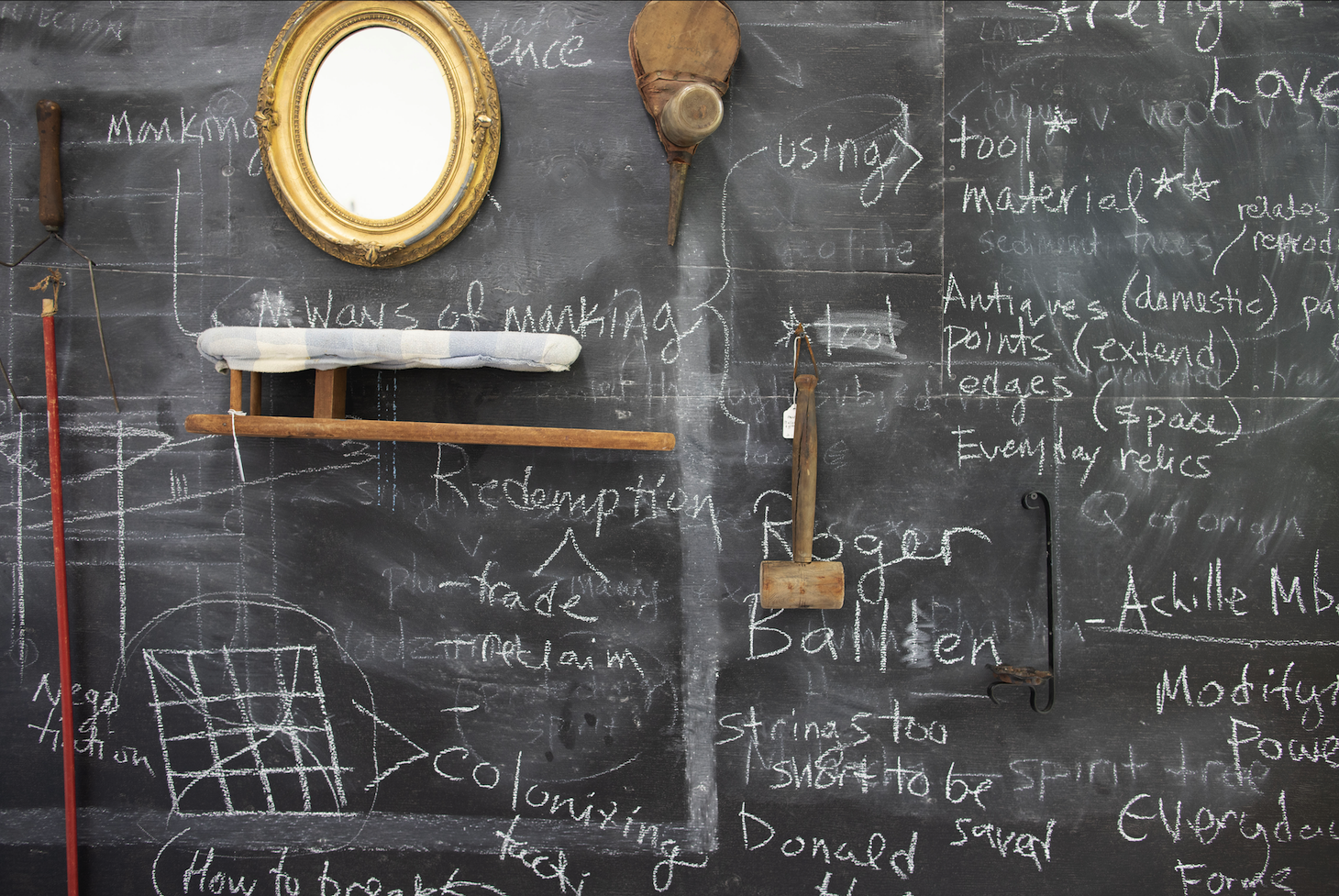 My easel consists of the dialogues I am engaged in whether they be found objects, theories, or conversation. They find their way into my studio through phone calls, face calls, or bits of notes — my wall catches them, nestled behind and entangled with attachments to the wall. During this pandemic I sit in meditation — reaching out to touch the ecosystem of thoughts I am reliant on, in relationship to, in conversation with. I keep all that is erased — the ghosts of my thoughts collaged together.
