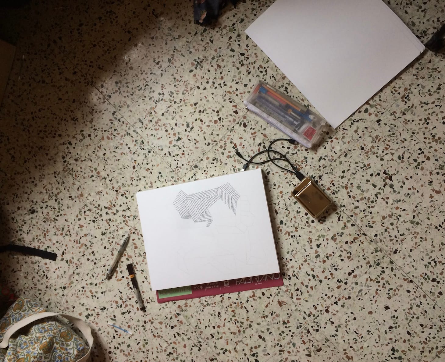 Boredom gave me time to clean the excess messages and emails from my phone. These texts and immobility have become materials to make a series of drawings; at least that’s the idea for now. These are also just sketches, yet a way of passing time in an ineffable period. I like to think as if I am using Law of Conservation of Energy, which states that energy can neither be created nor destroyed, and that energy can only be transferred or changed from one form to another. In these drawings, virtual trash becomes material to fill space in twisted architectural spaces that resemble crumbled paper or beaten metal sheets.