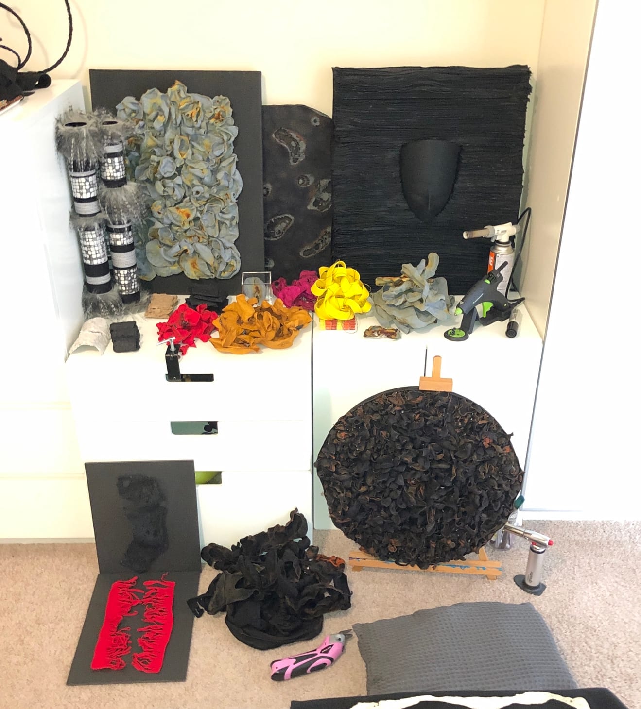 On March 9 I walked to dinner with my husband and returned hone. That was the last time I was out. I’m high-risk. I’ve suffered many respiratory illnesses, ICU, and intubation; home is where I am. I’ve survived much. Art is my salve, family is my peace. So I stay, during which I’ve scratched open many scabs to create pieces while inside. On view are several pieces in various states of progress. I like to work on more than one at a time.