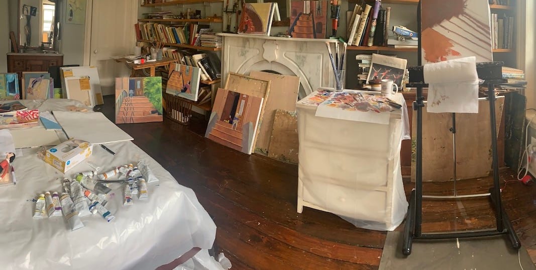 Being sequestered at home in Brooklyn has changed my routine as well as my subject matter. Because I am in the vulnerable group I have stayed home; because of this, I make sure to do a yoga routine every day first thing in the morning. Previously, I took daily walks of at least three miles, but these are no longer happening. Neither are commutes to my lovely studio in Soho where I have been working for more than 20 years. Instead, I have repurposed a guest room (which we are very lucky to have) into a studio by covering everything with plastic tarps. The bed has become a surface for supplies and pieces that are drying. A side table with drawers for guests’ belongings now serves as a palette table. I am taking inspiration from domestic surroundings, my environment inside and out. Brownstone details combined with figurative suggestions are a comfort for me right now. Smaller formats work for these personal pieces.