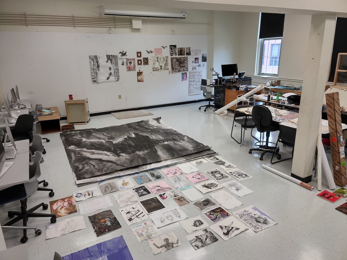 I moved from my studio in New Jersey to an artist-in-residence studio at East Tennessee State University (ETSU) in the span of a week and some change. Unfortunately, while moving in, my personal storage was flooded over the weekend and I’ve been drying the ones I could save here. I’ve been working around old works and finding a new way to archive my practice, while trying to maintain a daily workflow. However, I don’t make all my works here, they start at home on the floor when my legs go numb from sitting or greasy fingerprint life drawings in the woods — I’ve decentralized how I work. Despite this, I’m thoroughly grateful for the space and returning here gives me warm memories.