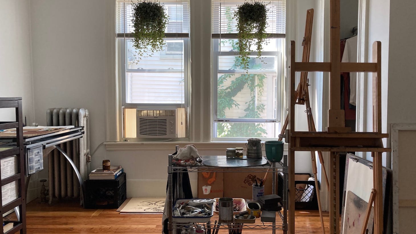 I work out of my rented bedroom in the Roxbury neighborhood of Boston. New additions to the studio since quarantine include two aquamarine pilea plants, two milk cartons to double as storage and seats, and way too many scented candles. While in isolation, I discovered the ambient musician Hiroshi Yoshimura, a godsend because I find his work deeply calming, and it complements the plants well. To cut costs, I’ve been painting more on cardboard instead of canvas, which has allowed me to be less attached to each new picture and work in new dimensions and shapes. And since the ventilated painting spaces at the nearby art school are closed, I’m experimenting more with acrylics and making compositions with colored paper.