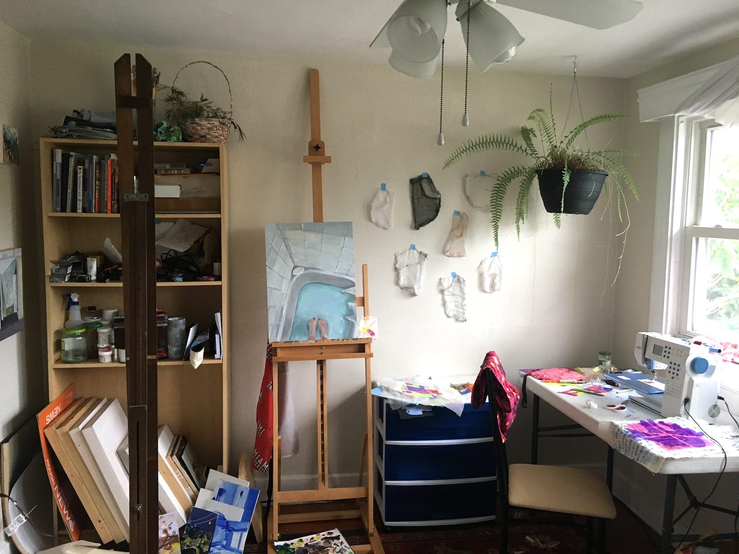 I am thankful for the natural light that the space receives. I keep my main work table directly in front of the window. I shift between painting and sewing most days. I like to have a few projects with different materials going at once to keep myself fresh.