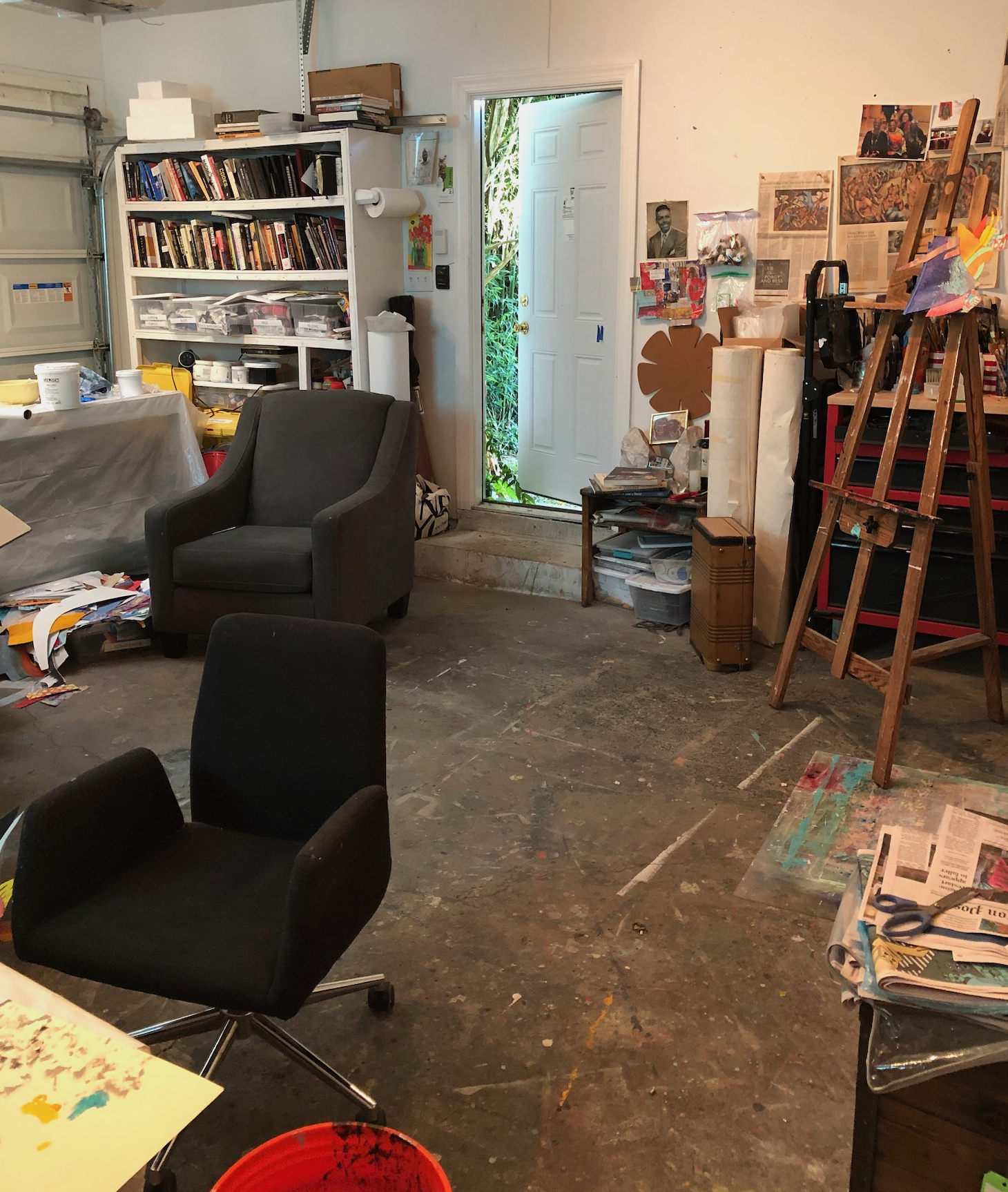 I am based in Cleveland, Ohio. My workspace is in a spare bedroom in my apartment. As you can see, all of my supplies are delegated to one wall. The other side is used by my partner as a home office. One half of the room is completely devoid of art stuff so that my partner can have a blank Zoom background. The challenge of this space is that I have to be aware of how much noise I’m making while working!