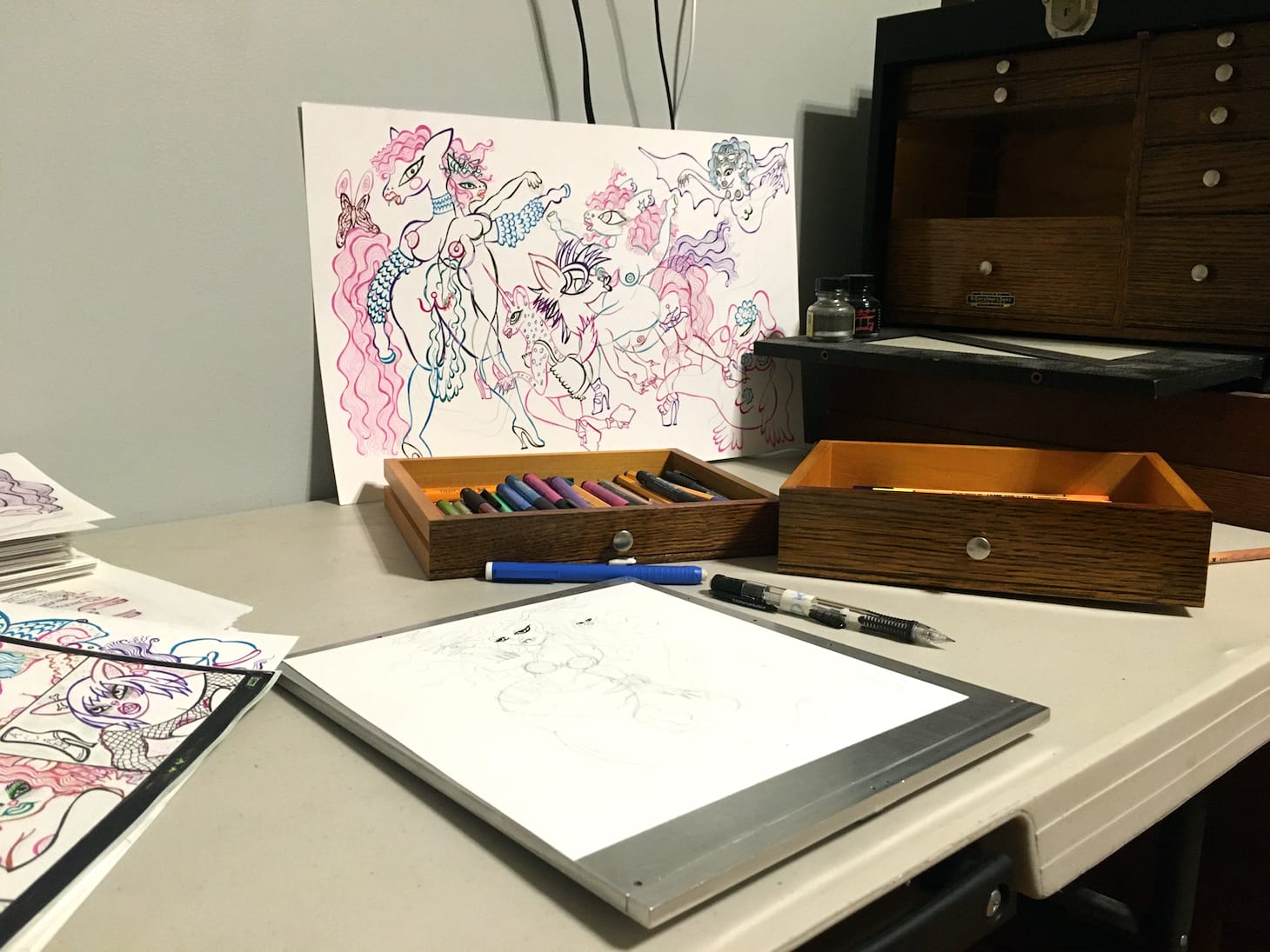My art typically deals with adventurous, queer human and critter sexuality from the perspective of an alter ego, Poppers the Pony. It’s generally fanciful or world building. Now I have a worktable in the living room for drawing and folding comics/zines. Luckily, I printed out pages for several little books before California began sheltering at home. Poppers made a comic about the cleaning process after visiting the feed store. It’s funny and contains multiple fetishes.