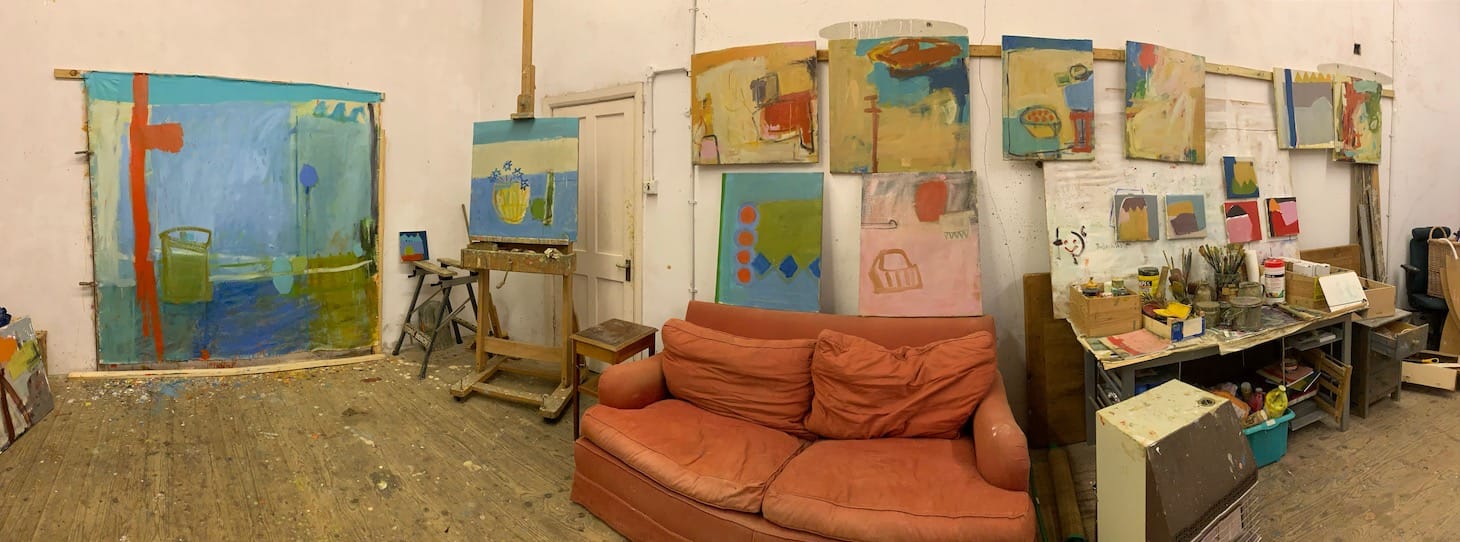I am in my studio in the North of England at the moment. I work between here and my home studio in the south of England. In Northumberland the views from my studio are distant and beautiful and I compete with the spiders for window space. My larger canvasses I paint stretched, nailed directly to the wall so that I can transport them south rolled up. I have lots of space here and I am enjoying the lack of pressure on my time. I share the studio here with an eclectic mix of things — a ping pong table, a vegetation shredder, a very old piano, and a wardrobe with mystery contents. With the diary now empty and confined to home there is an unusual peacefulness.