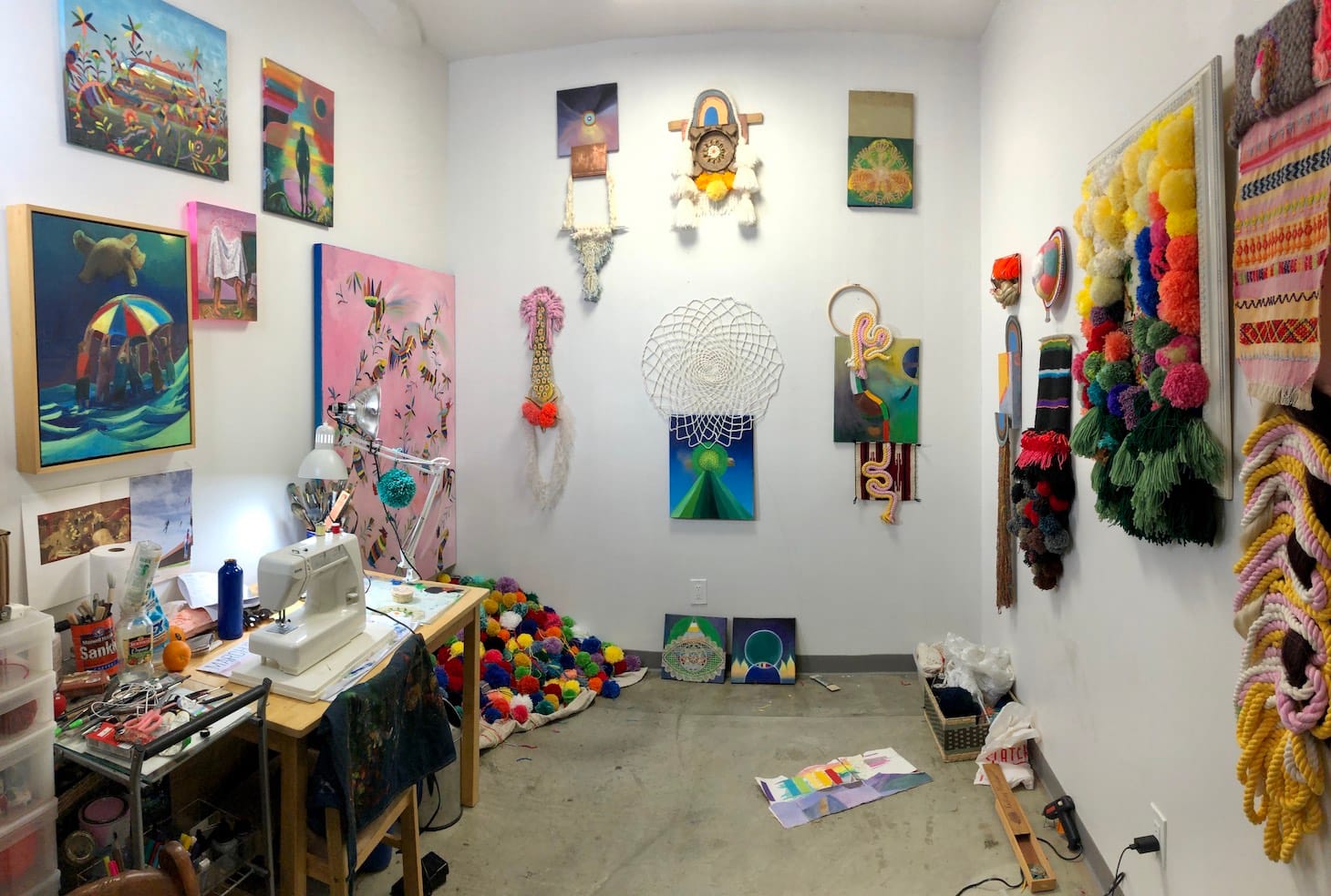 My work has changed since the #coronvirusartistresidency started. I began merging paint and fiber together in a cohesive way for the first time. They feel like healing alters or mandalas. I just busted out the sewing machine to start making masks for healthcare workers. I’m grateful for time to think, dance parties in my studio, and my health.